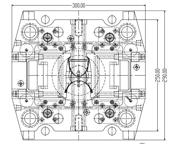 根據(jù)注塑機(jī)的能力,設(shè)計(jì)1出1的模具結(jié)構(gòu),模具設(shè)計(jì)圖見圖2,日精DC120T雙色注塑機(jī)的碼模位置見圖3,選定非標(biāo)模胚DDI2530,為了適合機(jī)器的旋轉(zhuǎn),特將模胚的角部做了大的倒角。設(shè)計(jì)雙色模具時(shí),模胚的大小一定不能超出機(jī)器允許的碼模范圍。