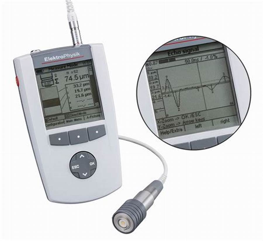 采用磁感應(yīng)原理時,利用從測頭經(jīng)過非鐵磁覆層而流入鐵磁基體的磁通的大小,來測定覆層厚度。也可以測定與之對應(yīng)的磁阻的大小,來表示其覆層厚度。覆層越厚,則磁阻越大,磁通越小。利用磁感應(yīng)原理的測厚儀,原則上可以有導(dǎo)磁基體上的非導(dǎo)磁覆層厚度。一般要求基材導(dǎo)磁率在500以上。如果覆層材料也有磁性,則要求與基材的導(dǎo)磁率之差足多大(如鋼上鍍鎳)。當(dāng)軟芯上繞著線圈的測頭放在被測樣本上時,儀器自動輸出測試電流或測試信號。早期的產(chǎn)品采用指針式表頭,測量感應(yīng)電動勢的大小 儀器將該信號放大后來指示覆層。近年來的電路設(shè)計(jì)引入穩(wěn)頻,鎖相,溫度補(bǔ)償?shù)鹊匦录夹g(shù)。利用磁阻來調(diào)制測量信號。還采用**設(shè)計(jì)的集成電路引入微機(jī),使測量精度和重現(xiàn)性有了大幅度的提高(幾乎達(dá)一個數(shù)量級】。