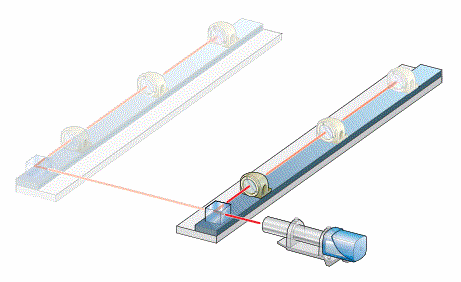 *好使用剛性螺栓將托架安裝到 導(dǎo)軌末端。如果無(wú)法實(shí)現(xiàn),可以將 自準(zhǔn)直儀直接裝在導(dǎo)軌上。 與自準(zhǔn)直儀配合使用的反射鏡安 裝在專為雙軸測(cè)量設(shè)計(jì)的支架 上。 沿著導(dǎo)軌的節(jié)距必須等距,因此 要采集的節(jié)距數(shù)將取決于反射鏡 支架的底座長(zhǎng)度及導(dǎo)軌的長(zhǎng)度。 兩個(gè)表面(導(dǎo)軌的的側(cè)面和頂面) 中任何一個(gè)表面的任何不平直將 導(dǎo)致支架相對(duì)于自準(zhǔn)直儀變化角 度,正是通過(guò)測(cè)量和自動(dòng)計(jì)算這 些變化來(lái)確定直線度誤差。 |