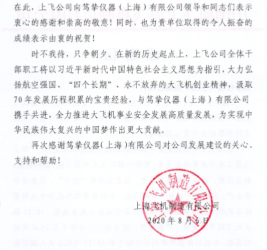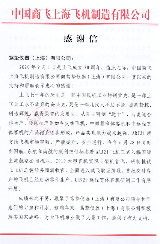 客戶為本,攜手共進(jìn),篤摯儀器收到來自中國商飛的感謝信