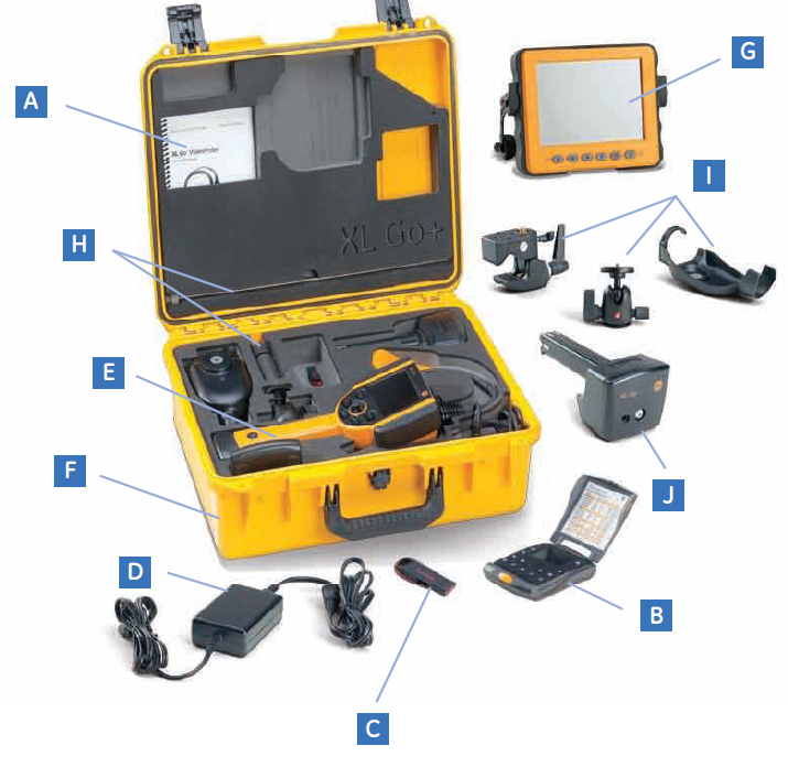 標(biāo)準(zhǔn)附件 A: 操作手冊 B: 光學(xué)鏡頭盒 C: 8GB 閃存盤® D: 交流電池充電器 E: 配裝 2 小時電池的 XL Go+ 系統(tǒng) F: 標(biāo)準(zhǔn)運輸/存儲箱 可選配件 G: XpertVision 外部監(jiān)視器 H: 管夾和緊固件 I: 迷你魔術(shù)安裝套件 J: 四小時電池