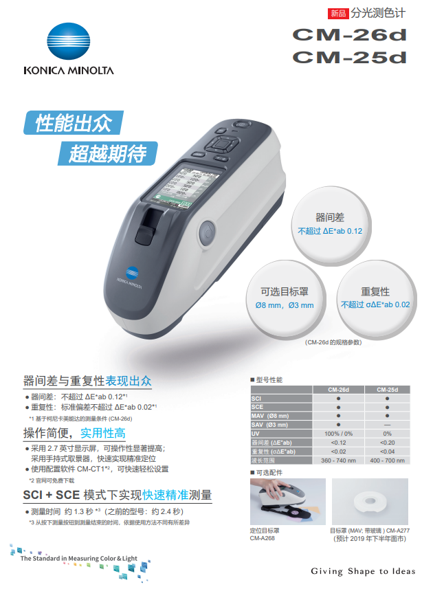 柯尼卡美能達(dá)的新一代CM-26dG系列,包含三款便攜式分光測色計型號。高端旗艦型號CM-26dG和CM-26d擁有精湛的技術(shù)和業(yè)界**的測量精度。其中,CM-26dG是二合一機(jī)型,可同時進(jìn)行色彩與光澤測量,CM-26d專注于色彩測量。CM-25d則是該系列的經(jīng)濟(jì)高效型號,高性價比之選。*支持同時測量色彩與光澤度的高端旗艦型CM-26dG預(yù)計于2019年秋季推出。