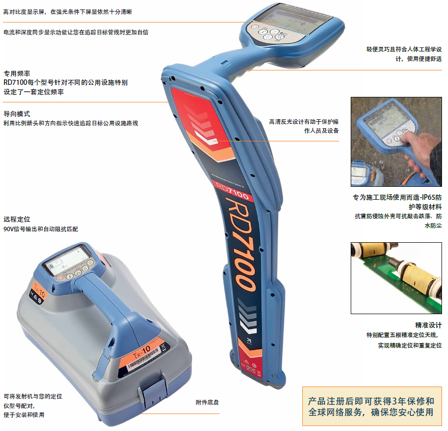 RD7100?是英國(guó)雷迪專為不同行業(yè)特別推出的定位儀系列,該系列均采用本公司先進(jìn)的定位技術(shù),每個(gè)型號(hào)經(jīng)過(guò)優(yōu)化設(shè)計(jì)專用于定位一類行業(yè)設(shè)施。我們的定位儀能夠精確定位并標(biāo)識(shí)埋設(shè)的公用設(shè)施,確保在修理或維護(hù)期間盡可能減少停機(jī),同時(shí)防止作業(yè)時(shí)損壞設(shè)施,以免對(duì)您和您的客戶造成巨大損失。全新RD7100系列定位儀采用英國(guó)雷迪公司先進(jìn)的定位技術(shù),每個(gè)型號(hào)經(jīng)過(guò)優(yōu)化設(shè)計(jì)專用于定位一類行業(yè)設(shè)施。用戶可根據(jù)需要,通過(guò)簡(jiǎn)潔的菜單選項(xiàng)自由選擇所需功能。帶內(nèi)置GPS和使用數(shù)據(jù)自動(dòng)記錄功能型號(hào)的定位儀有助于觀察遠(yuǎn)程施工人員遵守*佳作業(yè)規(guī)范的情況。安卓 RD Map 應(yīng)用程序是一款可創(chuàng)建埋地公用設(shè)施地圖的實(shí)時(shí)繪圖和共享工具,同時(shí),RD Manager PC 程序也為用戶提供一系列實(shí)用工具,例如安裝新軟件、使用 eCert? 遠(yuǎn)程驗(yàn)證定位儀校準(zhǔn)情況、免費(fèi)注冊(cè)產(chǎn)品以享有額外2 年質(zhì)保。