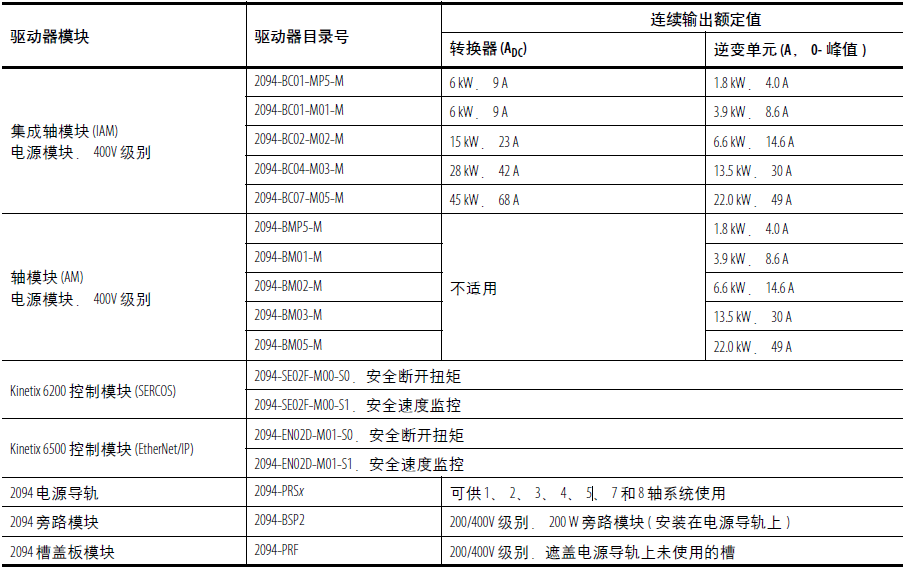 Kinetix 6200 和 Kinetix 6500 系統(tǒng)也可以包括一個或多個作為從 IAM 的 IAM 電源模塊(以及應用所需的相關(guān)軸模塊、電源導軌、電機、電纜和連接器套件)。也可選配以下組件