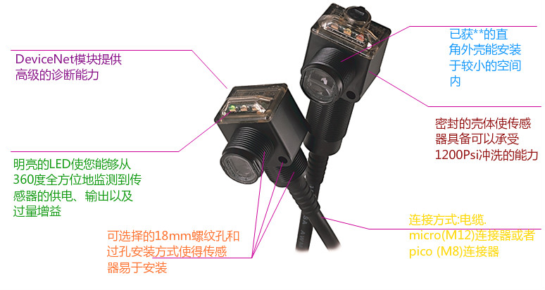 ClearSight? RightSight? 透明物體檢測傳感器的光學(xué)系統(tǒng)經(jīng)過修改,改進(jìn)了對塑料瓶等透明物體的檢測。它們有低壓 24V 直流型號,或者通用 24V 直流/120V 交流或 220V 交流型號。包括型號42EF-C2KBA-F4 和42EF-C2JBA-F4等。當(dāng)您的應(yīng)用需要一個耐用、功能齊全的光電傳感器,但要求空間較小、檢測距離不是很遠(yuǎn)時,RightSight 光電傳感器將是一個很好的選擇。該傳感器具有許多9000系列所具有的特性,只是將傳感器封裝于一個更小的、適應(yīng)性更強(qiáng)的外殼中。當(dāng)應(yīng)用場合對尺寸和形狀要求嚴(yán)格的情況下,這種傳感器能體現(xiàn)出卓越的檢測能力。RightSight 光電傳感器電壓范圍很廣(對于交直流24 - 264 V均支持),且在全電壓范圍內(nèi)均帶短路保護(hù)。 ClearSight? 透明物體檢測光電傳感器可解決傳感器面臨的三個最大挑戰(zhàn):對比、形狀變化和潮濕的環(huán)境。我們的傳感器可提供對玻璃和塑料瓶或薄膜等透明材料的可靠檢測。
