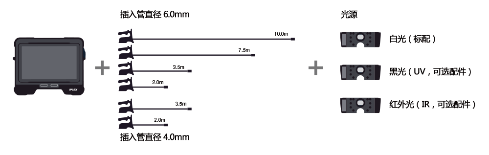 ? 內(nèi)窺鏡直徑 6.0 毫米:長(zhǎng)度 2.0 / 3.5 / 7.5 / 10 米 光源