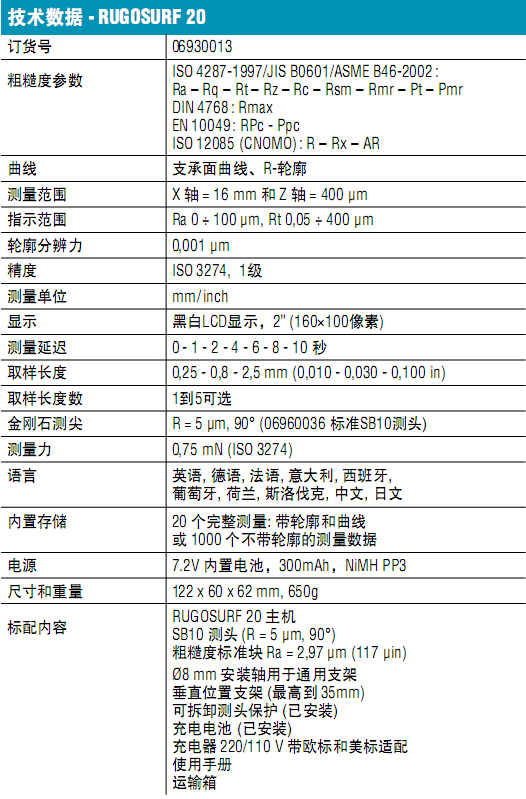 RUGOSURF 20 – 專門設(shè)計(jì)用于生產(chǎn)現(xiàn)場(chǎng)的便攜式粗糙度儀 ①Z軸測(cè)量范圍 400 μm ② 堅(jiān)固的金屬基座③ IP67薄膜鍵盤 ④15 種最常用的粗糙度參數(shù)⑤ 2'' LCD顯示, 每次測(cè)量后顯示參數(shù)和給定粗糙度輪廓 ⑥ 易于使用