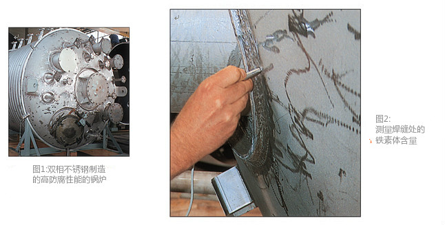 化工設(shè)備和石油加工廠通常要承受高溫、高壓,同時(shí)要耐腐蝕。外部環(huán)境要求所用鋼材即使在高溫下也要有足夠的耐腐蝕和耐酸性能。如果鐵素體含量太低,焊縫受熱后容易產(chǎn)生裂紋;如果鐵素體含量太高,焊縫將喪失韌性和延展性。對(duì)于雙相鋼,如果鐵素體含量太低,焊縫受到張力或發(fā)生振動(dòng)時(shí)容易破裂?;瘜W(xué)和石油化工行業(yè)越來越多地使用雙相鋼,例如:圖1和圖2中的鍋爐容器就是用高防腐性能的雙相不銹鋼制造的。如果焊縫處的鐵素體含量過低,受到張力或發(fā)生振動(dòng)時(shí)容易破裂。然而,在焊接雙相鋼時(shí),由于焊接添加劑或熱處理不當(dāng),焊縫處的鐵素體含量非常容易超標(biāo)。只有現(xiàn)場檢測才能確保處理過程不會(huì)改變*佳的鐵素體含量,防止機(jī)械性能或防腐蝕性能的下降。
