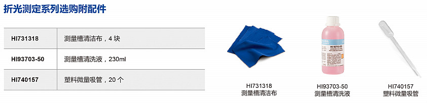 HI96802:主機,HI731318專用清洗布(2塊),中英文使用說明書,HI721006專用攜帶箱【溫馨提示:為了確保測量數(shù)據(jù)精準度,首次購買該款儀器時,訂購HI70436定制專用去離子水,用于儀器校準,訂購HI740157P專用微量塑料吸管,用于去離子水和待測樣品的提取,避免交叉污染】