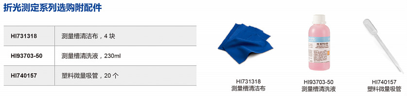 HI96811:主機,HI731318專用清洗布(2塊),中英文使用說明書,HI721006專用攜帶箱【溫馨提示:為了確保測量數(shù)據(jù)精準度,首次購買該款儀器時,訂購HI70436定制專用去離子水,用于儀器校準,訂購HI740157P專用微量塑料吸管,用于去離子水和待測樣品的提取,避免交叉污染】