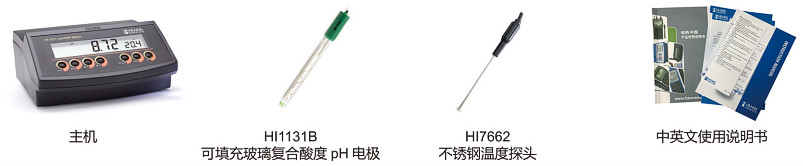 HI2211主機(jī),HI1131B 可填充玻璃復(fù)合酸度電極,HI7082S 專用電極填充液,規(guī)格:30mL,HI7662 不銹鋼溫度探頭,酸度標(biāo)準(zhǔn)緩沖液套裝(標(biāo)準(zhǔn)值@25°C:4.01pH、7.01 pH 和常規(guī)電極清洗液,規(guī)格:20mL×3),HI76404N 定制專用電極支架,HI710006 AC230V/12VDC 電源適配器,中英文使用說明書