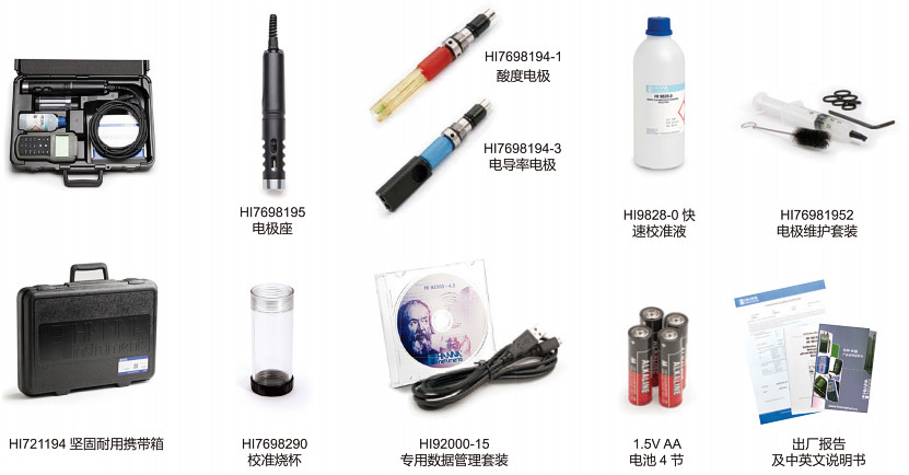 ①HI98195主機(jī),HI7698195-04 定制專用內(nèi)置pH-EC多參數(shù)電極,4米線長(zhǎng),HI9828-20 快速綜合校準(zhǔn)液(規(guī)格:230mL),HI7698290 定制專用快速校準(zhǔn)測(cè)量杯,HI920015 定制專用數(shù)據(jù)傳輸線【USB接口】,中英文使用手冊(cè),HI720194 定制專用儀器攜帶箱