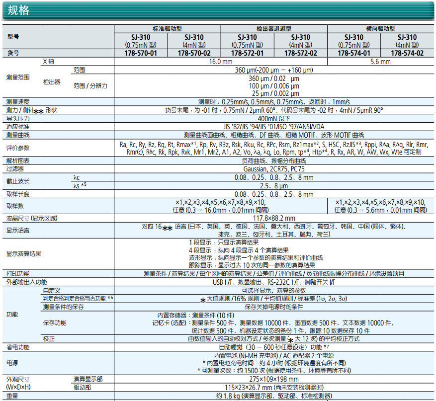Mitutoyo SJ-310是操作簡(jiǎn)單且能滿足多種需求的高級(jí)手持式測(cè)量?jī)x,配備大型觸摸屏彩色圖形液晶顯示器,實(shí) 現(xiàn)直觀操作和良好操作性。Mitutoyo SJ-310粗繼承原有型號(hào)的可操作性特點(diǎn),搭載全新 測(cè)量輔助和分析功能,提升操作性。該檢出器可根據(jù)測(cè)量面定位任何方向進(jìn)行 測(cè)量:水平、傾斜、頂部或垂直表面??蛇x存儲(chǔ)卡能保存大量測(cè)量數(shù)據(jù)。此外, 便捷功能跟蹤10能保存10組新測(cè)量數(shù)據(jù)。統(tǒng)計(jì)處理和GO/NG判斷功能有助于對(duì)數(shù)據(jù) 進(jìn)行管理。高速熱敏打印機(jī) (其打印速度約為傳統(tǒng)型 號(hào)的1.5倍)作為標(biāo)準(zhǔn)件提供。Mitutoyo SJ-310可打印測(cè)量 結(jié)果 (包括判斷結(jié)果) 和評(píng)定輪廓及BAC和 ADC輪廓。支持橫向模式打印與液晶顯示 器上的顯示效果相配。