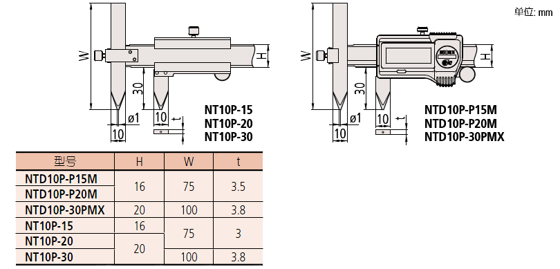 偏置中心線卡尺573, 536 系列NTD10P · NT10P系列: