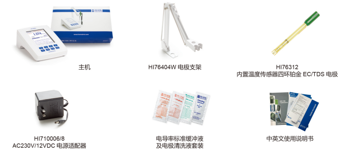 HI5321主機(jī),HI76312 內(nèi)置溫度傳感器四環(huán)鉑金EC/TDS電極,電導(dǎo)率標(biāo)準(zhǔn)緩沖液套裝(標(biāo)準(zhǔn)值@25°C:1413 μS/cm、5000 μS/cm、12880 μS/cm ,定制專用電極清洗液,規(guī)格:20mL×10)、HI7100061/8 AC230V/12VDC電源適配器、中英文使用說(shuō)明書(shū)