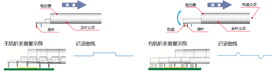 無軌測量以保證了驅(qū)動部直線度的導(dǎo)軌為基準,通過移動檢出器,測針的上下變位量檢測出表面的凹凸,實現(xiàn)對表面粗糙度、波度以及細微的階差形狀的測量。有軌測量對測量工件表面的較大波形進行追蹤,從而搖動帶有導(dǎo)軌的檢出器。此時,將以導(dǎo)軌為基準的測針的上下變位量作為表面的凹凸進行檢出。