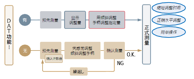 標準配備有強力支持無軌測量時水平調(diào)整作業(yè)DAT (Digital Advanced Tilting)功能的上下傾斜裝置。DAT (Digital Advanced Tilting)功能,可先進行預(yù)先測量,從其測量結(jié)果來計算測量面的傾斜度。任何人都可以簡單地進行水平調(diào)整,既能減輕人為誤差還可提高作業(yè)效率。