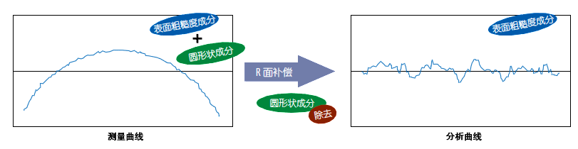 球面或圓柱面的表面粗糙度是無法直接測量的,但除去圓形狀成分進行補正即可進行表面粗糙度評價。除了圓形外,還可以對應(yīng)拋物線、圓錐形、傾斜等表面的測量。