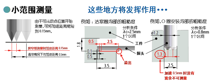 測量表面粗糙度時在開始測量(讀取數(shù)據(jù))前,需要加速距離。SJ-410在通常測量下設(shè)置了0.5mm的加速距離。這個距離能縮短到0.15mm,就是小范圍測量功能(從驅(qū)動部原點位置到開始)。此功能將測量范圍擴展到可對活塞圈、0形圈安裝槽部等空間狹小位置的粗糙度的測量也可實現(xiàn)。