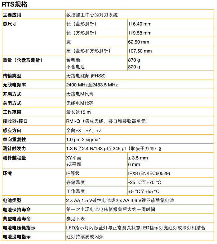 用于在立式和臥式加工中心以及龍門加工中心上進行刀具測量和刀具破損檢測。RTS是一款無線對刀儀,適用于小型到大型加工中心,或者測頭和接收器之間的光信號無線電傳輸傳輸被遮擋的場合。RTS是雷尼紹新一代無線電測頭系列的一部分,其設計符合全球標準,工作頻帶為2.4GHz,它采用調頻技術,確保信號傳輸不受干擾。