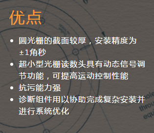它提供多種尺寸(直徑從52 mm到417 mm)和刻線數,所有這些都具有內徑大、安裝靈活的特點。非接觸形式消除了傳統(tǒng)封閉式光柵固有的反向間隙、扭轉誤差(扭變)及其他機械滯后誤差。