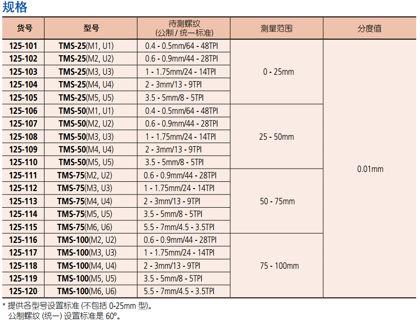 ? 固定測砧可測量 60o 螺紋。