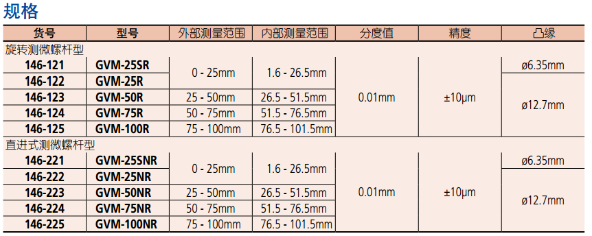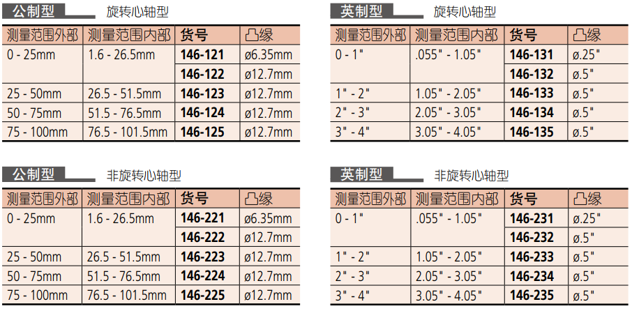 Mitutoyo 146機(jī)械槽千分尺的范圍為0 - 1",內(nèi)部范圍為.055" - 1.05"和凹緣?.25"。特點(diǎn)千分尺心軸上帶有凸緣,可用來測(cè)量凹槽內(nèi)/外孔和管材內(nèi)外凹槽深度和位置關(guān)系。包括內(nèi)部和外部測(cè)量的兩種刻度。配有一個(gè)不旋轉(zhuǎn)的主軸和兩個(gè)方向棘輪鎖定裝置。