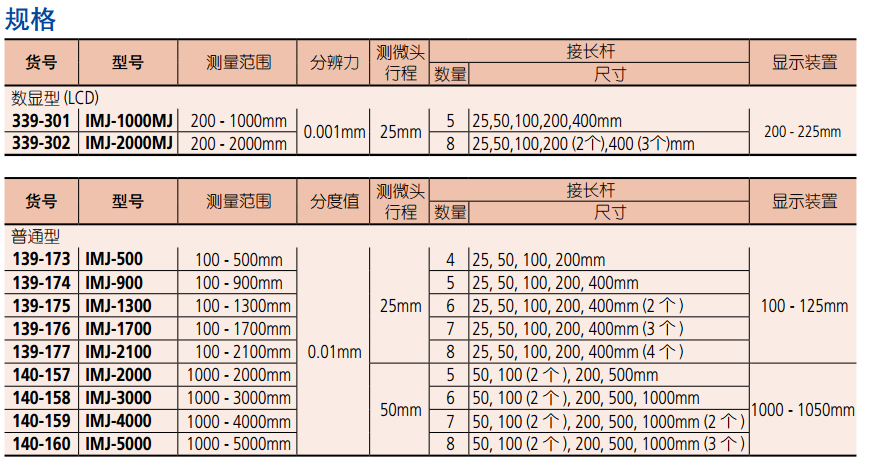 339系列精度:±(3+接桿數(shù) + *大測(cè)量長(zhǎng)度/50 )μm (小數(shù)圓整)