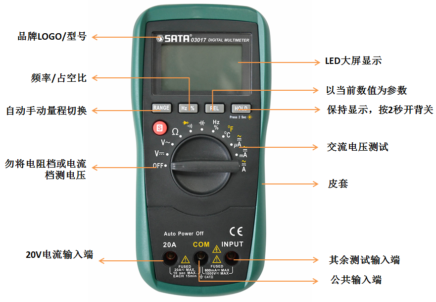 2. 主要特性:交/直流電壓、交/直流電流、電阻、電容、頻率、通斷性、二極管、溫度測(cè)量、背光功能
