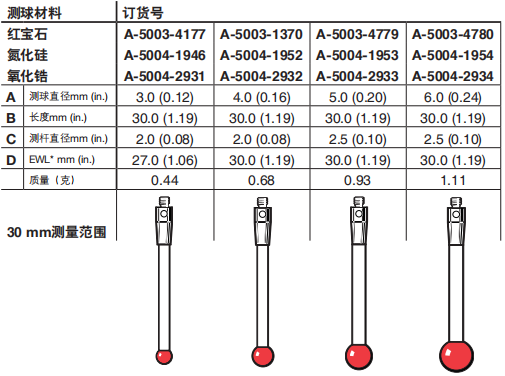 直測(cè)針適用于檢測(cè)可無阻礙地直接接觸被測(cè)表面的簡(jiǎn)單特征。陶瓷測(cè)桿的重量輕但剛性極強(qiáng),本身具有很好的碰撞保護(hù)特性。紅寶石被公認(rèn)為用于測(cè)針的行業(yè)標(biāo)準(zhǔn)材質(zhì),它是目前可得到的*堅(jiān)硬的材料之一,適合大多數(shù)應(yīng)用。由于存在粘附磨損現(xiàn)象,掃描鋁質(zhì)工件時(shí)不建議使用紅寶石測(cè)針.