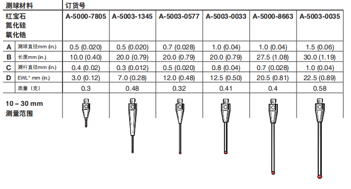 M2 ?0.5 mm紅寶石測球,碳化鎢測桿,長度10 mm,有效工作長度3 mm產(chǎn)品代碼: A-5000-7805