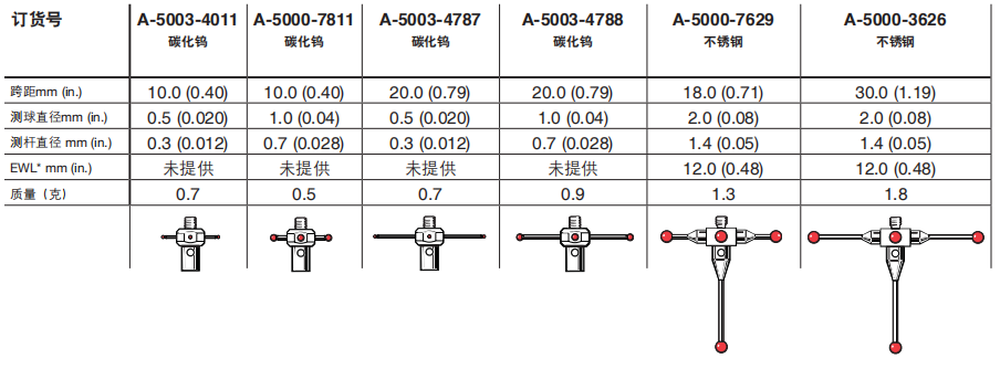 星形測針可用于檢測各種不同的特征。使用這些測針可進(jìn)行多測尖檢測,大大減少了將測頭移至工件內(nèi)部的特別點(diǎn)(例如,內(nèi)孔的側(cè)面或凹槽)的需要,從而縮短了檢測周期。使用五向測頭時(shí)搭配星形測針,其測尖可超過測頭本體直徑,用來增加-Z向(向上)的有效測頭測量。星形測針的每個(gè)測尖需要以單球測針一樣的方式標(biāo)定(有時(shí)稱為檢定或校準(zhǔn))。星形測針的跨距是指兩端測球中心的距離。