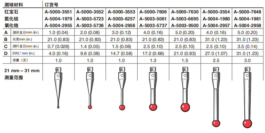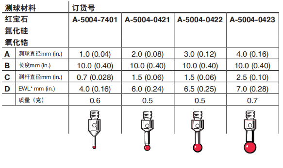 直測(cè)針適用于檢測(cè)可無(wú)阻礙地直接接觸被測(cè)表面的簡(jiǎn)單特征。不銹鋼測(cè)桿具有卓越的剛性,非常適合用于對(duì)重量要求不十分高的應(yīng)用。紅寶石被公認(rèn)為用于測(cè)針的行業(yè)標(biāo)準(zhǔn)材質(zhì),它是目前可得到的*堅(jiān)硬的材料之一,適合大多數(shù)應(yīng)用。由于存在粘附磨損現(xiàn)象,掃描鋁質(zhì)工件時(shí)不建議使用紅寶石測(cè)針。