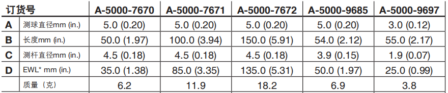 直測針適用于檢測可無阻礙地直接接觸被測表面的簡單特征。不銹鋼測桿具有卓越的剛性,非常適合用于對重量要求不十分高的應(yīng)用。碳化鎢測針非常適合用于和被測工件的接觸點具有很高耐磨要求的應(yīng)用。銀質(zhì)鋼測針經(jīng)過熱處理和研磨加工,精度可滿足很高公差要求。這些測針用于工件接觸式測頭;將碳化鎢測球銅焊在測桿上,以確保測針整體的導(dǎo)電性。按規(guī)定,這些測針的電阻須小于0.1 Ω,以確保測頭準確測量。