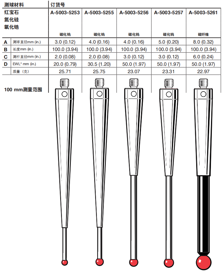 M5 ?3 mm紅寶石測球,碳化鎢測桿,長度100 mm,有效工作長度20 mm,產品代碼: A-5003-5253