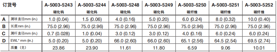 M5 ?10 mm紅寶石測球,碳纖維測桿,長度75 mm,有效工作長度69.5 mm,產(chǎn)品代碼: A-5003-5252