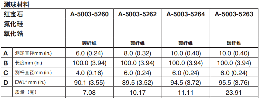 對(duì)于絕大多數(shù)測(cè)量場(chǎng)合來(lái)說(shuō),在具有業(yè)界標(biāo)準(zhǔn)和良好特性的測(cè)球材料中,紅寶石是已知*硬的材料之一。人造紅寶石是在2000 ℃下用Verneuil工藝方法燒結(jié)成的純度為99%的氧化鋁晶體(剛玉)。然后將剛玉切割并逐漸加工為高精度球體。紅寶石測(cè)球的表面很光滑,具有很高的抗壓強(qiáng)度和很高的機(jī)械耐磨性能。很少有不以紅寶石作為*選測(cè)球材料的應(yīng)用場(chǎng)合,但在兩種情況下建議采用其他材料制成的測(cè)球。第一種情況是對(duì)鋁材進(jìn)行高強(qiáng)度掃描的應(yīng)用場(chǎng)合。因?yàn)?/span>這些材料之間有親和力,會(huì)發(fā)生一種稱為“粘附磨損”的現(xiàn)象,使被測(cè)件表面的鋁積聚在測(cè)球上。對(duì)于這種應(yīng)用場(chǎng)合有一種更好的材料,就是氮化硅。第二種情況是在鑄鐵上進(jìn)行高強(qiáng)度掃描的應(yīng)用場(chǎng)合。兩種材料之間的相互作用會(huì)產(chǎn)生對(duì)紅寶石測(cè)球表面的“摩擦磨損”。對(duì)于這種應(yīng)用場(chǎng)合,建議采用氧化鋯測(cè)球。