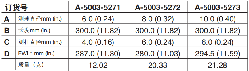 該直測針用于檢測可直接接觸的簡單特征。紅寶石被公認(rèn)為用于測針的行業(yè)標(biāo)準(zhǔn)材質(zhì),它是目前可得到的*堅硬的材料之一,適合大多數(shù)應(yīng)用。由于存在粘附磨損現(xiàn)象,掃描鋁質(zhì)工件時不建議使用紅寶石測針。碳纖維測桿的重量非常輕,非常適合用于對重量要求嚴(yán)格的應(yīng)用。紅寶石是一種非常堅硬的材料,因此測球的磨損甚微。它還具有較低密度,使測尖的質(zhì)量*小,從而避免了因設(shè)備運行或振動而引起測頭的誤觸發(fā)。測球安裝在一系列材料的測桿上 — 不銹鋼、碳化鎢、陶瓷及專用碳纖維材料“雷尼紹GF”— 這種簡單的紅寶石球測針適用于大多數(shù)檢測應(yīng)用場合中。