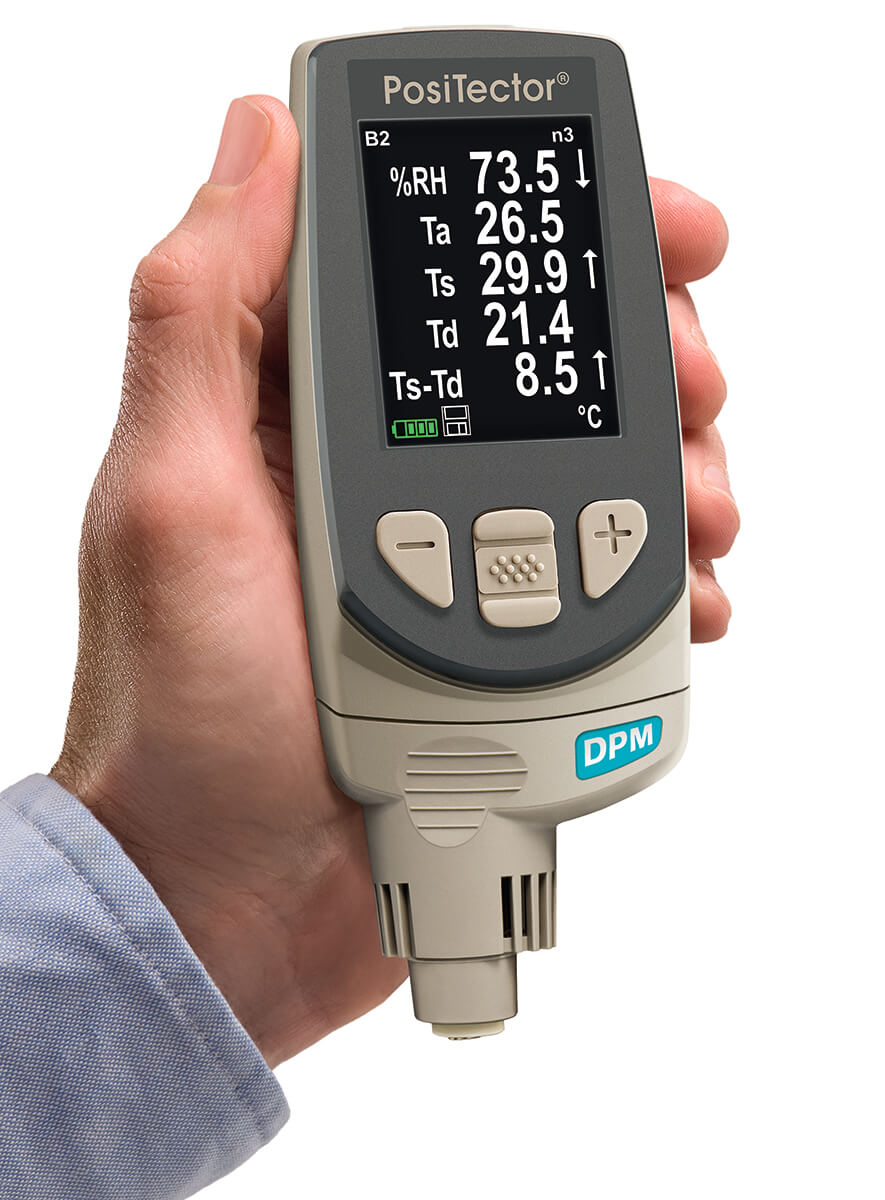 PosiTector® DPM溫濕度露點儀可測量和記錄氣候條件:相對濕度、空氣溫度、表面溫度、露點溫度、風(fēng)速、表面溫度與露點溫度的差值。