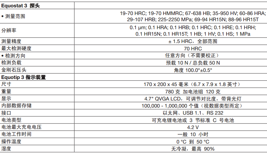 頭、圓形標(biāo)準(zhǔn)腳、橡膠保護(hù)套)、 Equostat 3 測(cè)試塊 (~62 HRC)、 USB 線纜、包含 Equolink 3 軟件