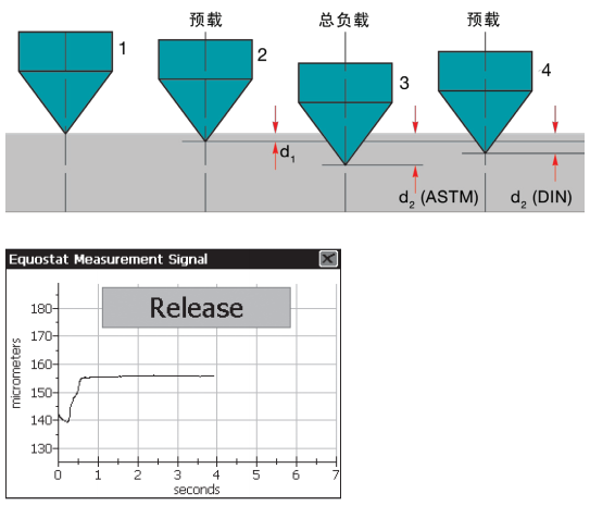 Equostat 3 的硬度檢測(cè)原理遵循洛氏硬度固定式檢測(cè)。在通過 Equostat 3 探頭進(jìn)行測(cè)量的過程中,金剛石壓頭壓入到要測(cè) 量的測(cè)試件中,然后釋放并返回材料外部。在施加負(fù)載并釋放的同時(shí),連續(xù)測(cè)量金剛石壓頭的壓入深度。通過記錄施加兩個(gè) 限定負(fù)載時(shí)的壓入深度 d1 和 d2 來計(jì)算差異:Δ = d2 – d1 。差異 Δ 是材料硬度的測(cè)量值,與檢測(cè)方向無關(guān)。 與傳統(tǒng)固定式洛氏硬度檢測(cè)相比有三個(gè)主要差別: