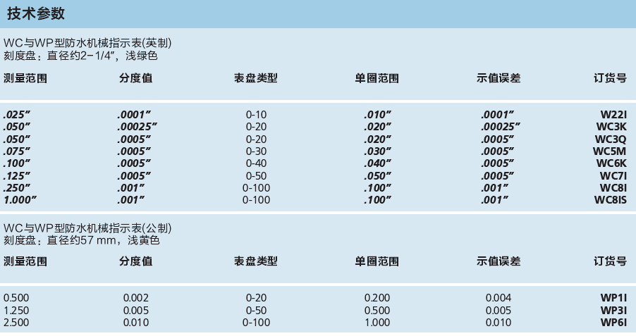 可以防冷卻液、油或其他污染物的飛濺,WC與WP型防水機械指示表(英制)刻度盤:直徑約2-1 /4",淺綠色。WC與WP型防水機械指示表(公制)刻度盤:直徑約57 mm,淺黃色