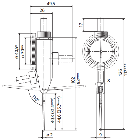 塑料盒,更換測(cè)桿專(zhuān)用扳手,測(cè)頭直徑為2 mm的測(cè)桿,夾持柄800 a8(用于公制),