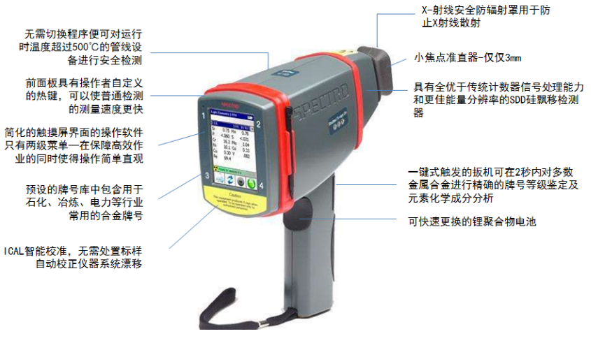 xSORT是新一代手持式能量色散型X熒光光譜儀,無需樣品前處理、進(jìn)行非破壞無損分析;短時(shí)間內(nèi)在SPECTRO xSORT的手持式ED-XRF光譜儀家族可對(duì)迥異條件下的多種材料進(jìn)行元素測試和光譜化學(xué)分析。這些能量色散X射線熒光設(shè)備因其堅(jiān)固性和可靠性而得到認(rèn)可。它們在數(shù)秒內(nèi)完成非金屬鑒別,其創(chuàng)新技術(shù)和設(shè)計(jì)成就可重復(fù)的實(shí)驗(yàn)室級(jí)結(jié)果。簡單友好的顯示及高效的人體工程學(xué)設(shè)計(jì)使這些儀器非常容易使用。SPECTRO xSORT系列光譜儀價(jià)格合理,應(yīng)用廣泛,為同級(jí)中之佼佼現(xiàn)場高速原位直接分析測定,可直接對(duì)金屬、土壤、泥漿、粉塵、薄膜、礦粉等未知樣品進(jìn)行‘解剖’分析;分析范圍廣,從超低含量( PPM級(jí))至高百分比含量。